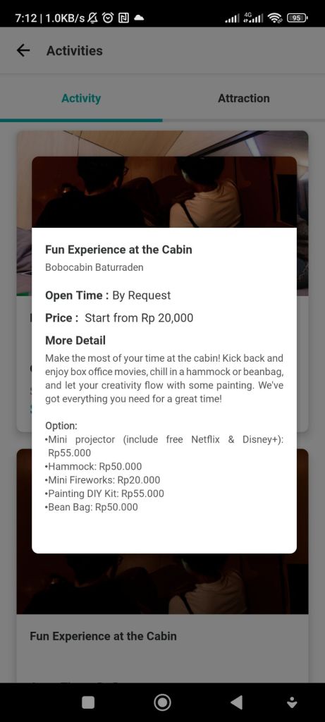 Di Bobocabin ga ada televisi ya. Kalau mau ada entertainment, bisa sewa proyektor dengan durasi per jam (kirain bisa disewa sampe checkout 😂). Selain proyektor, kita juga bisa request api unggun, barbeque, dst.